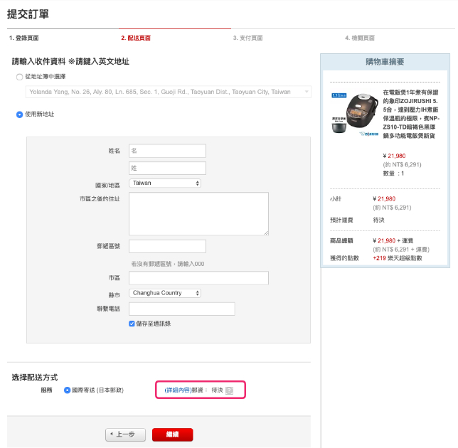 Step 7: 這時樂天會要你再次登入確認身份,並填妥寄送地址、支付方式等。