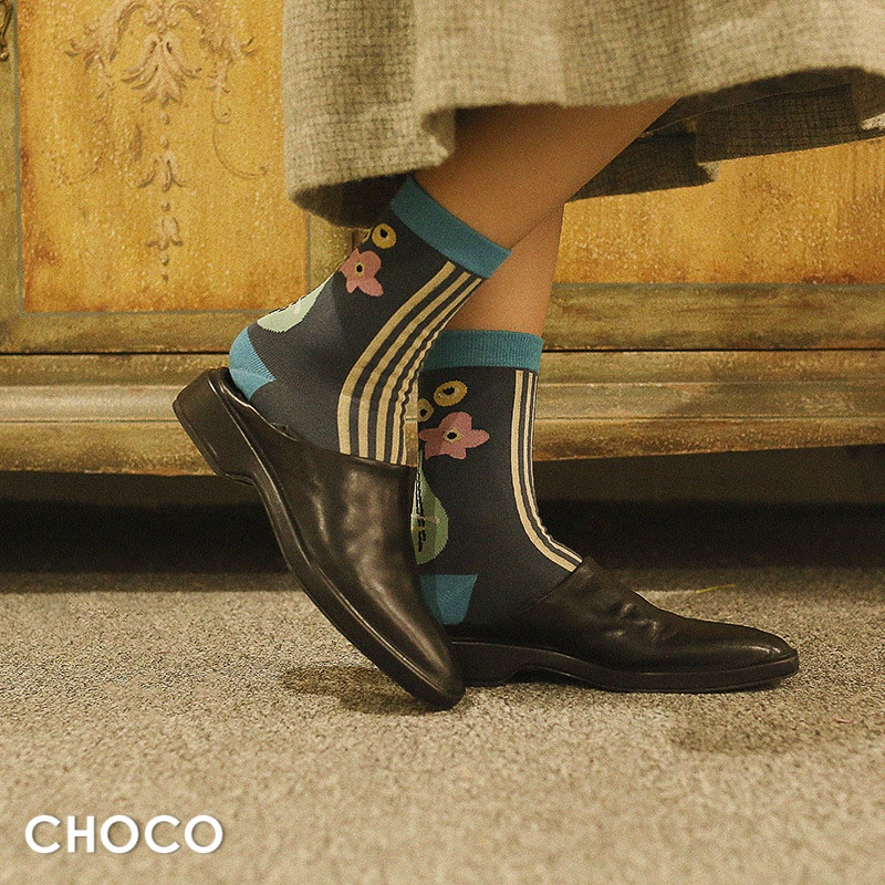 這款中筒襪以野獸派為元素,鮮明大膽的色彩結合,花卉圖案設計融入復古色調,搭配了米白色的牛津鞋,就更顯氣質了,一位素雅少女的形象就脫穎而出,日系妹子就是你啦!