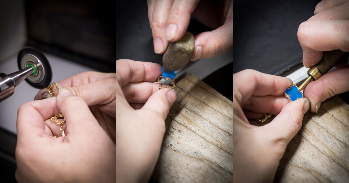 Alhambra 系列延續 Van Cleef & Arpels 梵克雅寶完美體現精益求精的傳統,結合了寶石切割師、珠寶師、寶石鑲嵌師及拋光師的畢生技藝,充分對每件作品把關。且世家深受大自然啟發,從中嚴格篩選各式完美無瑕的鑽石、珍珠母貝及硬寶石等珠寶素材。每件珠寶作品經過15道工序以上,寶石的切割、拋光、潤飾、鑽石粒鑲技術、鏤空蜂巢結構等細膩技術要求無疑是為珠寶呈現最完美的一面,經由選材、精鑄及品質監管,才能創造出萬世流芳的經典傑作。