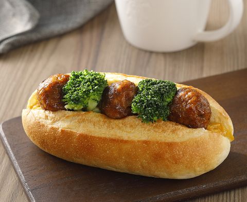 蔬食肉丸三明治 將Beyond Meat加入有咬感的菇類、花椰菜碎、以義式香料提味,手工捏製成球形,在軟式法國麵包中,加入整朵綠色花椰菜,拌炒過的洋蔥絲,搭配少許辣雞芥末醬,增加口感及香氣。