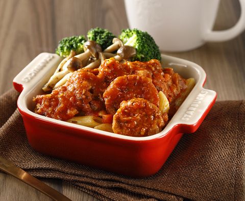 蔬食肉醬義大利麵 將Beyond Meat做成肉餅及加入自製肉醬(義式香料、洋蔥、番茄泥…等特色食材),舖在筆管麵上方,另加花椰菜及鴻禧菇類,豐富層次。