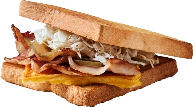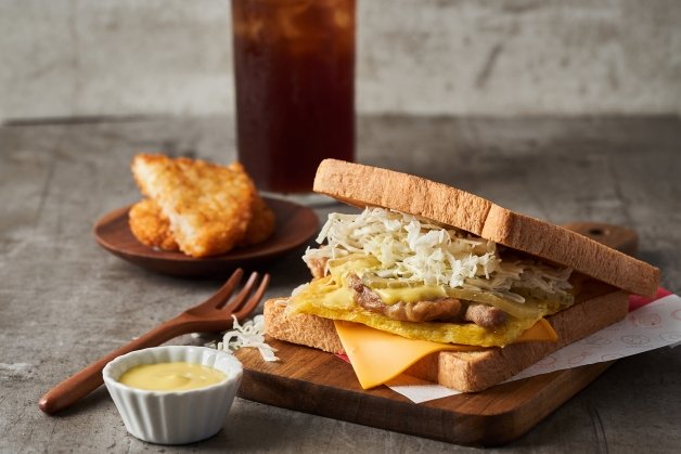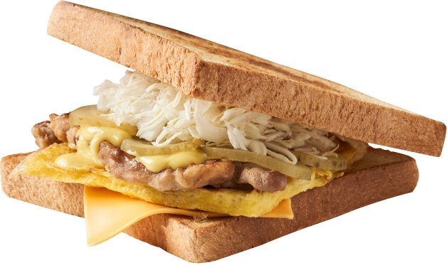 「MVP本土產厚里肌豬」使用本國產溫體豬肉並煎到微焦,搭配新鮮高麗菜絲、韓國酸黃瓜、起司片、玉米蛋,最後再擠上酸甜的蜂蜜芥末醬,吐司奶油香氣十足,吃起來更是香嫩多汁,飽滿感十足,是台灣獨家研發口味!