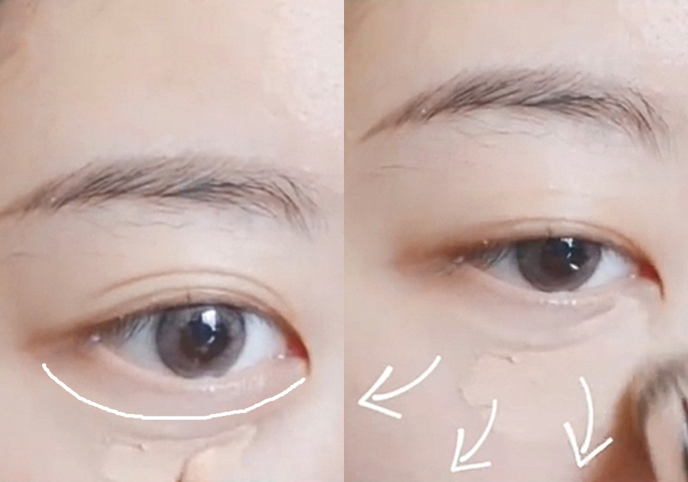 黑眼圈遮瑕建議在底妝前進行,選擇與膚色相近的遮瑕色號、可以再底妝前先將黑眼圈進行校色,將遮瑕畫在眼下黑眼圈的起始點上,之後以沾濕的美妝蛋或是遮瑕刷,將遮瑕「往下」暈染到整個黑眼圈部位,記得不要蓋到臥蠶,會讓眼妝顯髒之外、也顯得眼睛看起來更小。