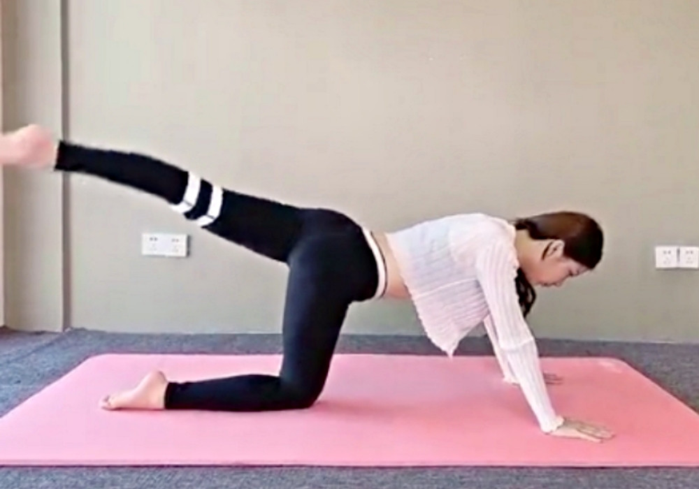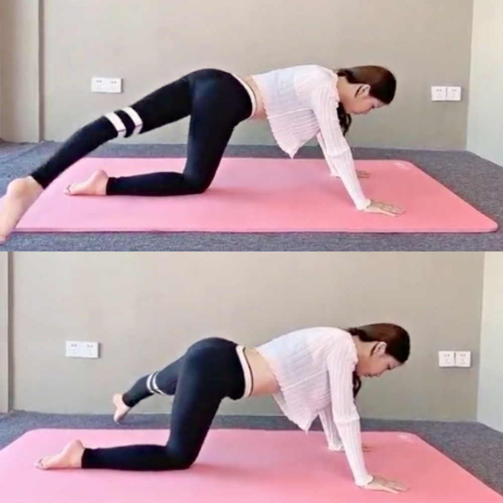 以小腿膝蓋、手掌著地呈現跪姿,整個身體與雙手雙腳呈現約ㄇ字,接著向後抬起一隻腿,記得將腿伸直、不要彎曲。