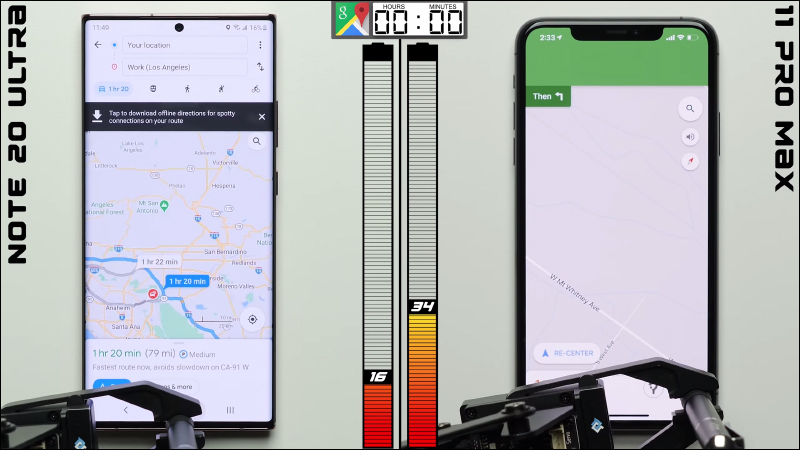Google Maps 導航功能操作 1 小時, Galaxy Note 20 Ultra 剩餘電量為 16% , iPhone 11 Pro Max 剩餘電量 34% :