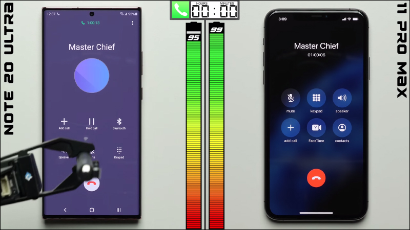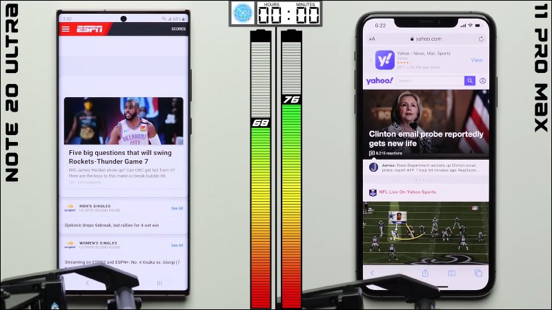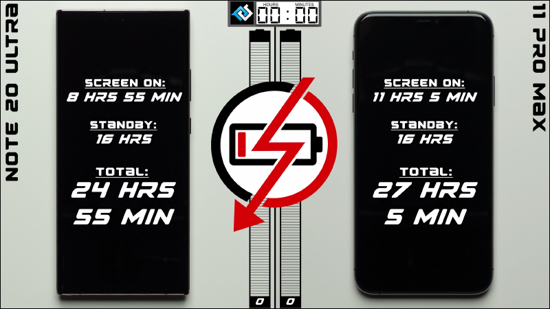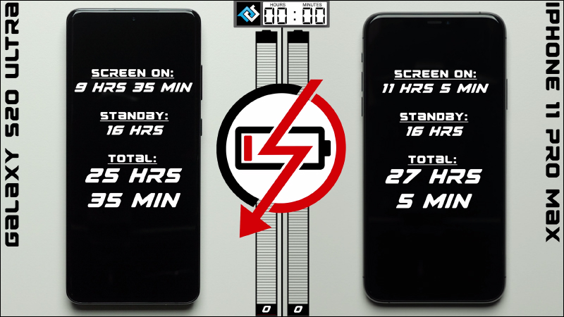 在 Galaxy S20 Ultra 對決 iPhone 11 Pro Max 的測試期間,兩款手機都經歷 16 小時的待機準備,最終結果三星 Galaxy S20 Ultra 也螢幕喚醒時間續航為 9 小時 35 分鐘、總續航 25 小時 35 分,而 iPhone 11 Pro Max 則以螢幕喚醒時間續航 11 小時 5 分、總續航 27 小時 5 分鐘獲勝。