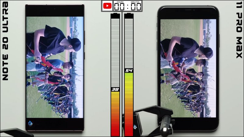 接著在進行 1 小時的 YouTube 影片播放, Galaxy Note 20 Ultra 剩餘電量為 38% , iPhone 11 Pro Max 剩餘電量 54% :