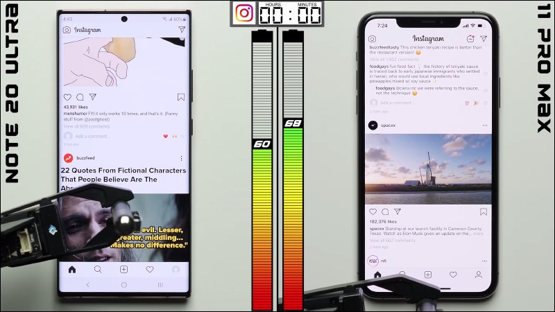 接下來使用 Instagram 測試 1 小時後, Galaxy Note 20 Ultra 剩餘電量為 60% , iPhone 11 Pro Max 剩餘電量 68% :
