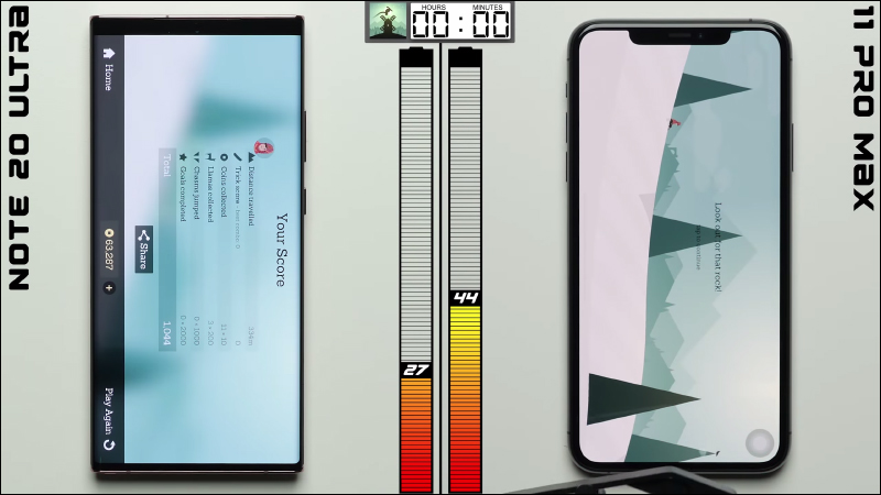 後來也遊玩 1 小時的遊戲, Galaxy Note 20 Ultra 剩餘電量為 27% , iPhone 11 Pro Max 剩餘電量 44% :