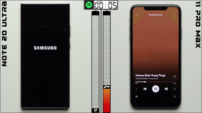 不過到了 Spotify 串流音樂播放測試 1 小時這階段, Galaxy Note 20 Ultra 在測試未結束還有 5 分鐘就已經電力耗盡。