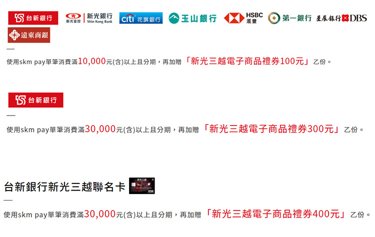 活動期間內,持指定銀行信用卡綁定skm pay至新光三越消費,憑新光三越貴賓卡/銀卡/兒童卡/APP過卡,當日當店刷卡,且分期達指定門檻,即可直接回饋「指定金額電子商品禮券」一份。