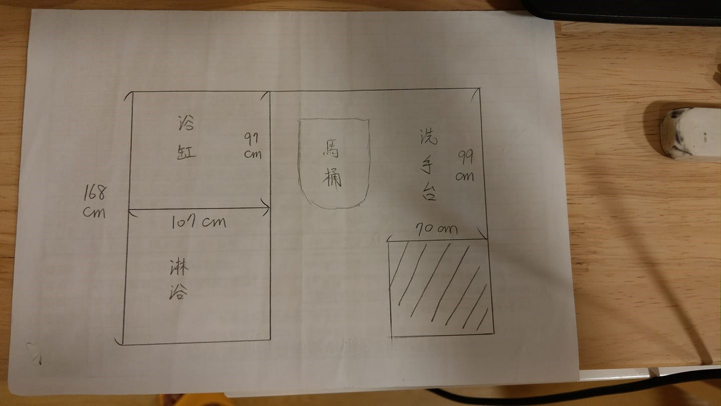 浴室坪數約僅1.5坪,由於屋主需求是要乾濕分離以及放得下3個貓砂盆,故平面圖看起來如下。動線大概是左邊淋浴泡澡區,中間是馬桶,最右邊是洗手台。