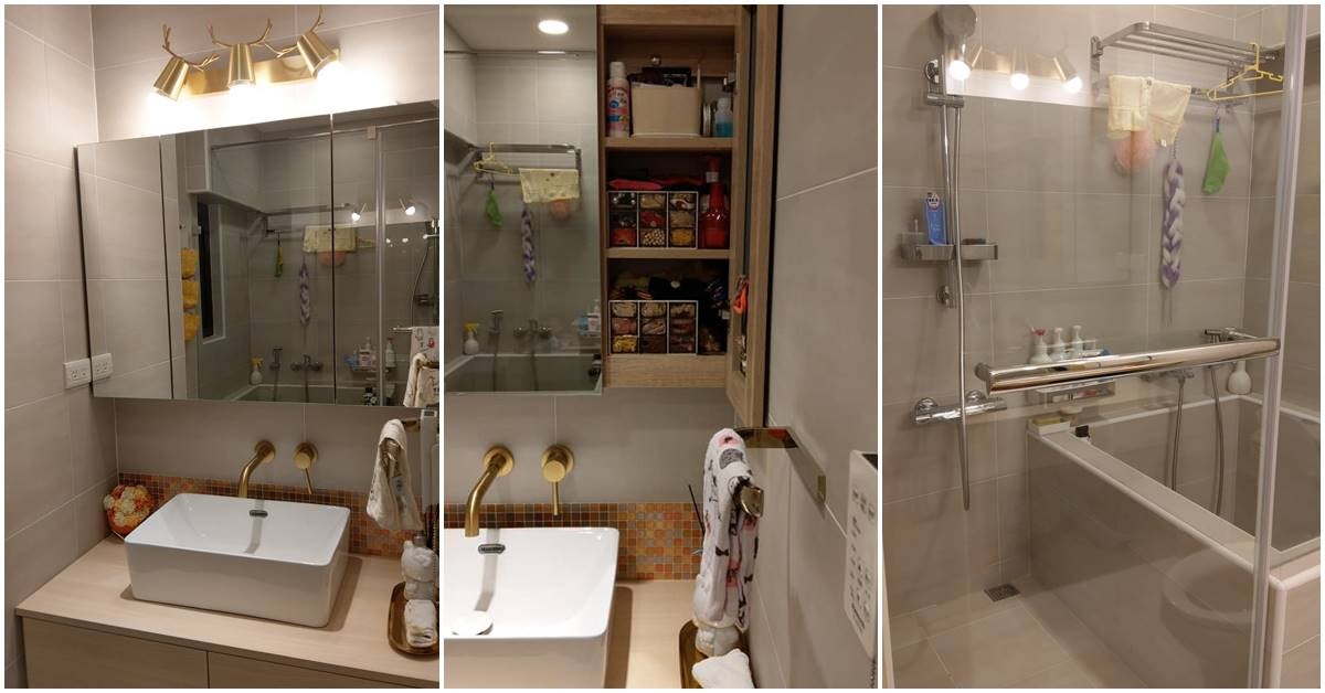 屋主為了自己的小浴室,花費蠻多心思,鏡櫃、燈飾、水龍頭、洗臉盆等不僅自己上網購買、找專門運家具的轉運倉,以走海運進入,運費則按重量計算。泡澡浴缸礙於尺寸受限,先找鐵工廠施作在找泥作師傅美化,也相當具有巧思。