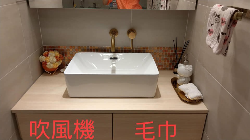 洗手檯面是請台灣的系統櫃廠商做好,上方的臉盆和金色水龍頭是從掏寶買來的