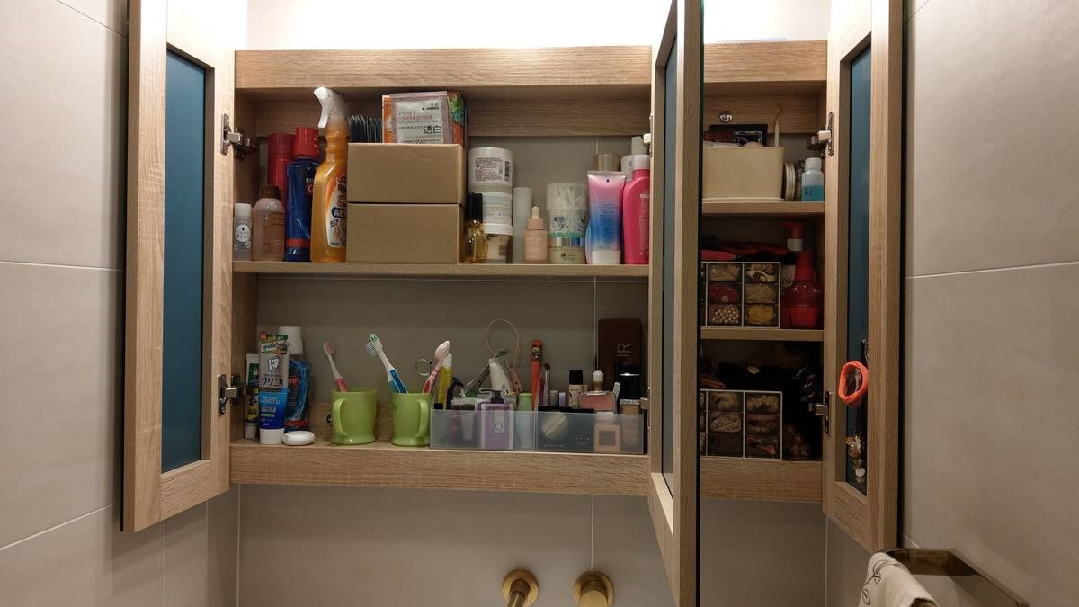 鏡櫃與牆面距離的尺寸事先都量好,組裝上去後令屋主相當滿意,打開鏡面可為小浴室提供海量收納,像是牙刷、洗臉及沐浴用品、清潔劑等,都可以裝進這鏡櫃裡。
