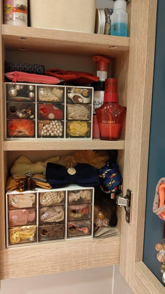 右邊小側櫃是在蝦皮上購買的九宮格收納盒,可以將髮飾分門別類收好。