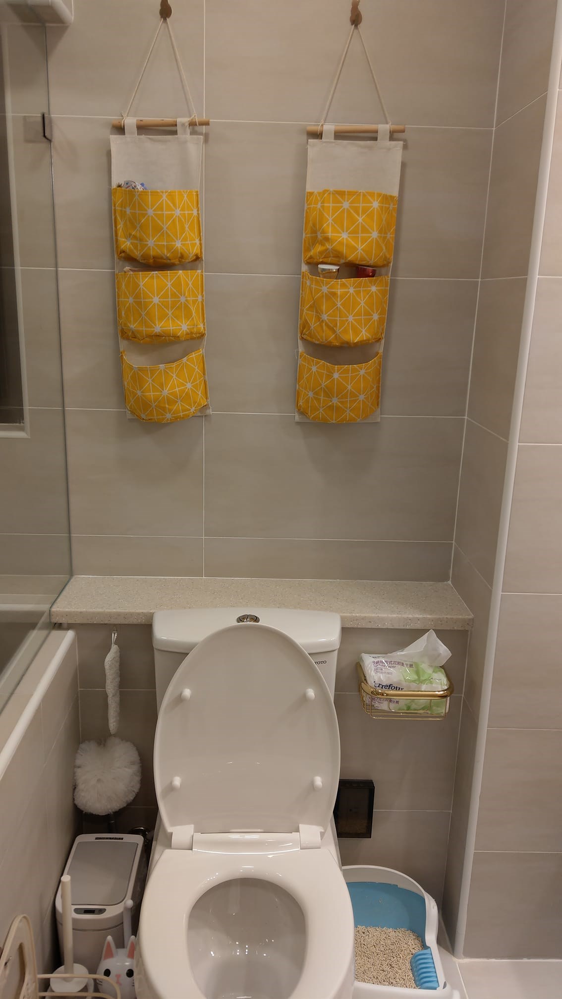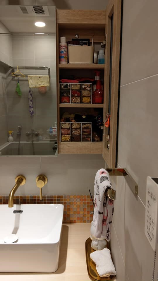 網友Lin Hui Wu的浴室大約僅1.5坪,廁所很小間但是有泡澡習慣,所以堅持一定要做浴缸,加上還要塞進3個貓咪的貓砂盆,實在是一個難題,還好Lin Hui Wu的收納做得不錯,透過淘寶購買整面牆的鏡櫃來收納東西,讓小小的廁所得以收納許多東西,實用美觀兼顧。