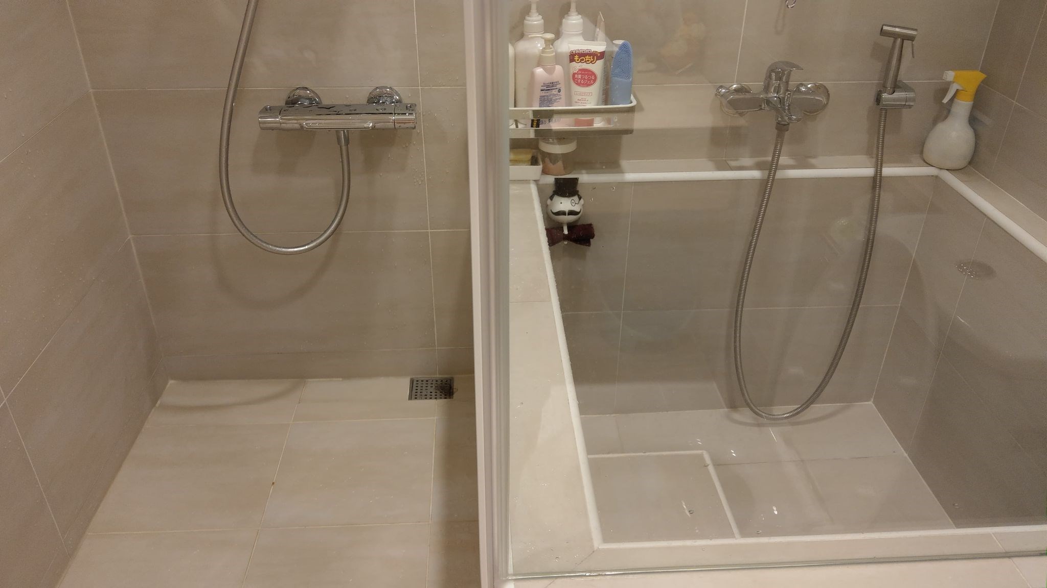 淋浴區跟浴缸那區有用玻璃隔開,所以水氣不太會散出來,而且每天洗完澡都立刻開乾燥機烘乾,所以也不太需要擔心鏡櫃會發霉的問題。