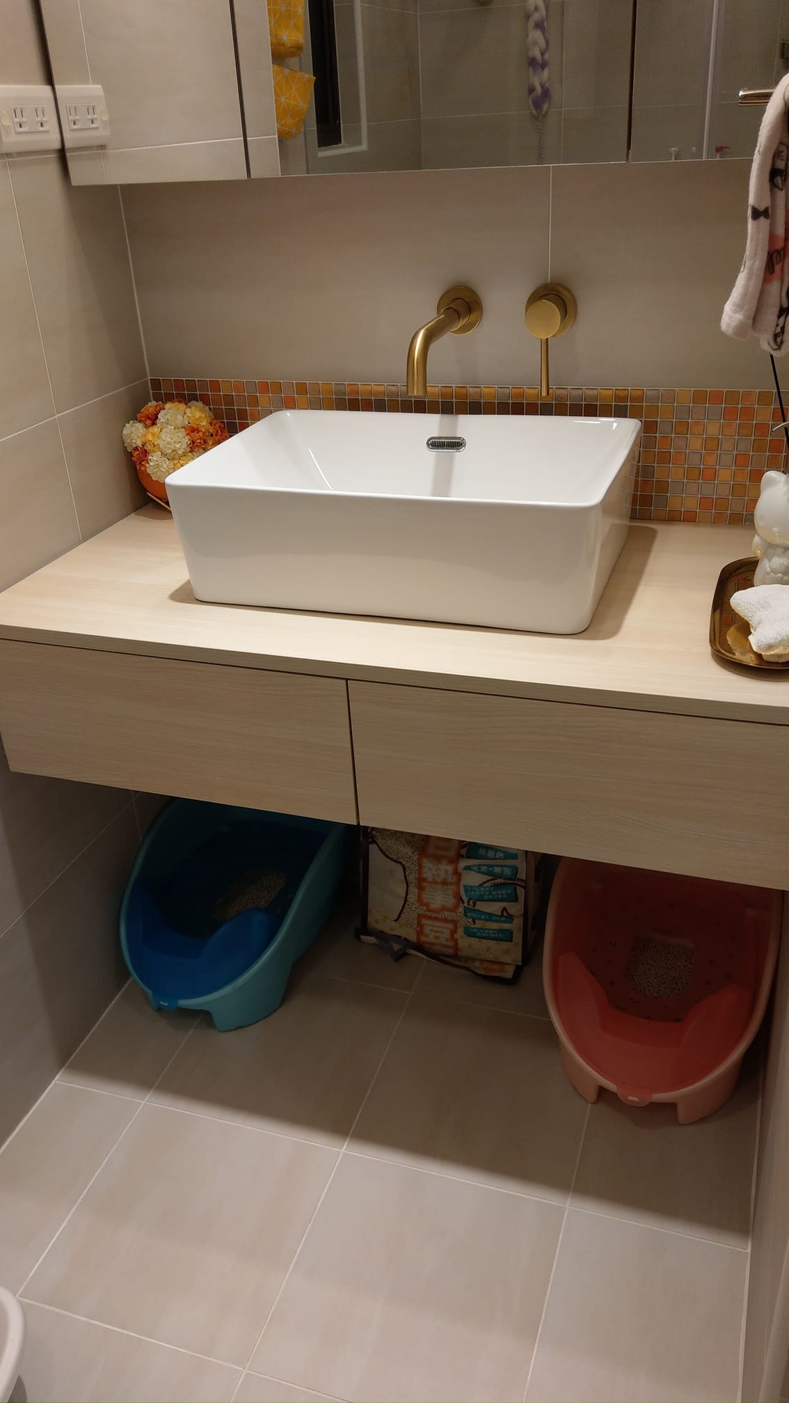 貓砂盆藏在洗手台下方,兩個放在洗手台下面,一個放在馬桶旁邊(剛好擋住馬桶後面的一個凹槽,不然貓一直要躲進去