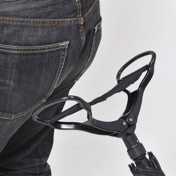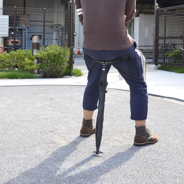 這把雨傘在握柄處做了特殊設計,是一個可以撐開的機構,可以讓屁股坐下。
