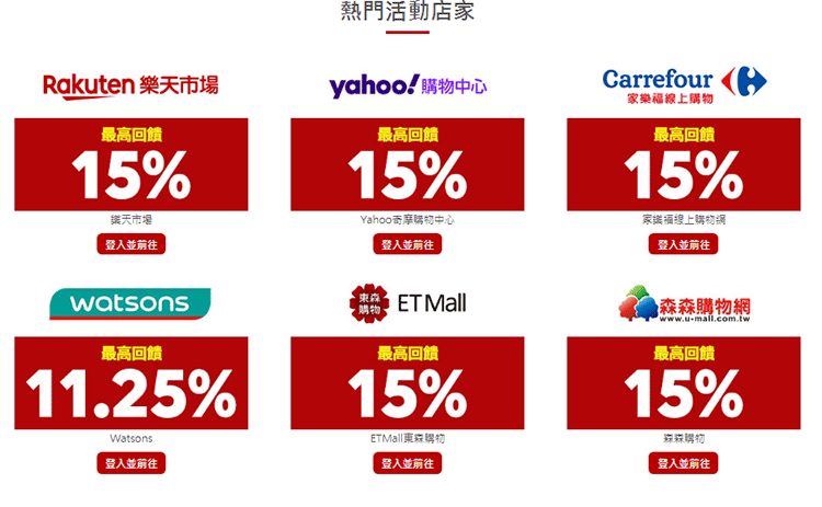 於2020/9/22~9/28,持台灣樂天信用卡透過指定連結至指定通路(綜合電商、流行時尚、休閒旅遊、保健/食品)刷卡消費享10%+登錄E起同樂5%=最高享15%回饋。