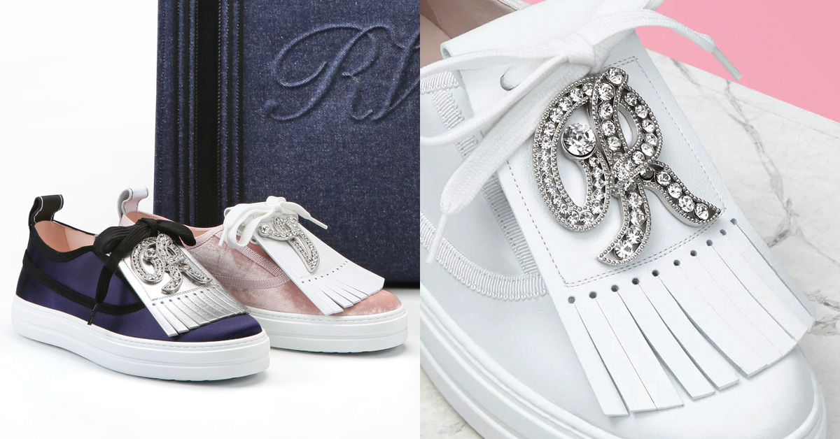 細節不只如此,此系列的秋冬新款中,品牌更將這個可更換的流皮革蘇精進,將創意總監Gherardo Felloni最喜愛的「水鑽珠寶」鑲嵌於上,讓「RV」字樣整個煥發立體光芒(上圖右)。就如前段提到Roger Vivier深受不少台灣消費者的歡迎,每年的業績表現也都有著不俗的表現。薦於此,這次更為台灣消費者們推出全球獨家、僅在台灣才有的「Call Me Vivier Jewel」流蘇休閒鞋限定專屬色款,分別是:藍色緞面搭配銀色山羊皮飾水鑽流蘇,以及櫻花粉絲絨配白色皮革飾水鑽流蘇(上圖左)。