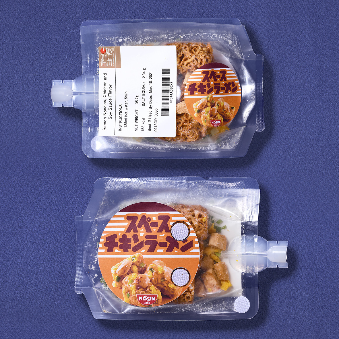 之前日清太空食品已經有杯麵、海鮮杯麵和咖哩杯麵,新進榜的食品則是是元祖雞拉麵、U.F.O炒麵(野口聰一指定開發)、咖哩燴飯及牛肉燴飯,麵體採整塊設計,湯包和醬油也增稠設計,在無重力的環境下也不會四處飛散,以特別的太空食品加工技術只要用70度熱水泡開即可食用,在太空站吃到熟悉的味道可以讓太空人紓解壓力。