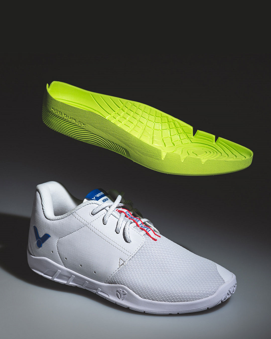 看到 VICTOR VGR10 第一眼,就知道他們清楚各部位的性能重點是什麼,前段以雙層網布鞋面強調靈活與透氣,後側則由 PU 合成革來強化腳踝鎖定,簡約的四孔鞋帶足以解決日常中所會遇到的各種狀況,輕鬆調節即可出門。而 VICTOR VGR10 鞋身部分編輯最喜歡內襯填充的用心,不會過於厚實而悶腳(尤其現在白天氣溫還是會超過 30˚C),且後跟加厚成為阿基里斯腱的舒適依靠。VICTOR VGR10 也能看到專業運動鞋的概念,例如外側中底高起一塊的防側翻,或是拇指 TPU 強化預防受傷,再再展現 VICTOR 並不把他當作普通休閒鞋看待,而是代表台灣前進世界舞台的中華隊著用機能鞋款,用鞋去支持運動員們。