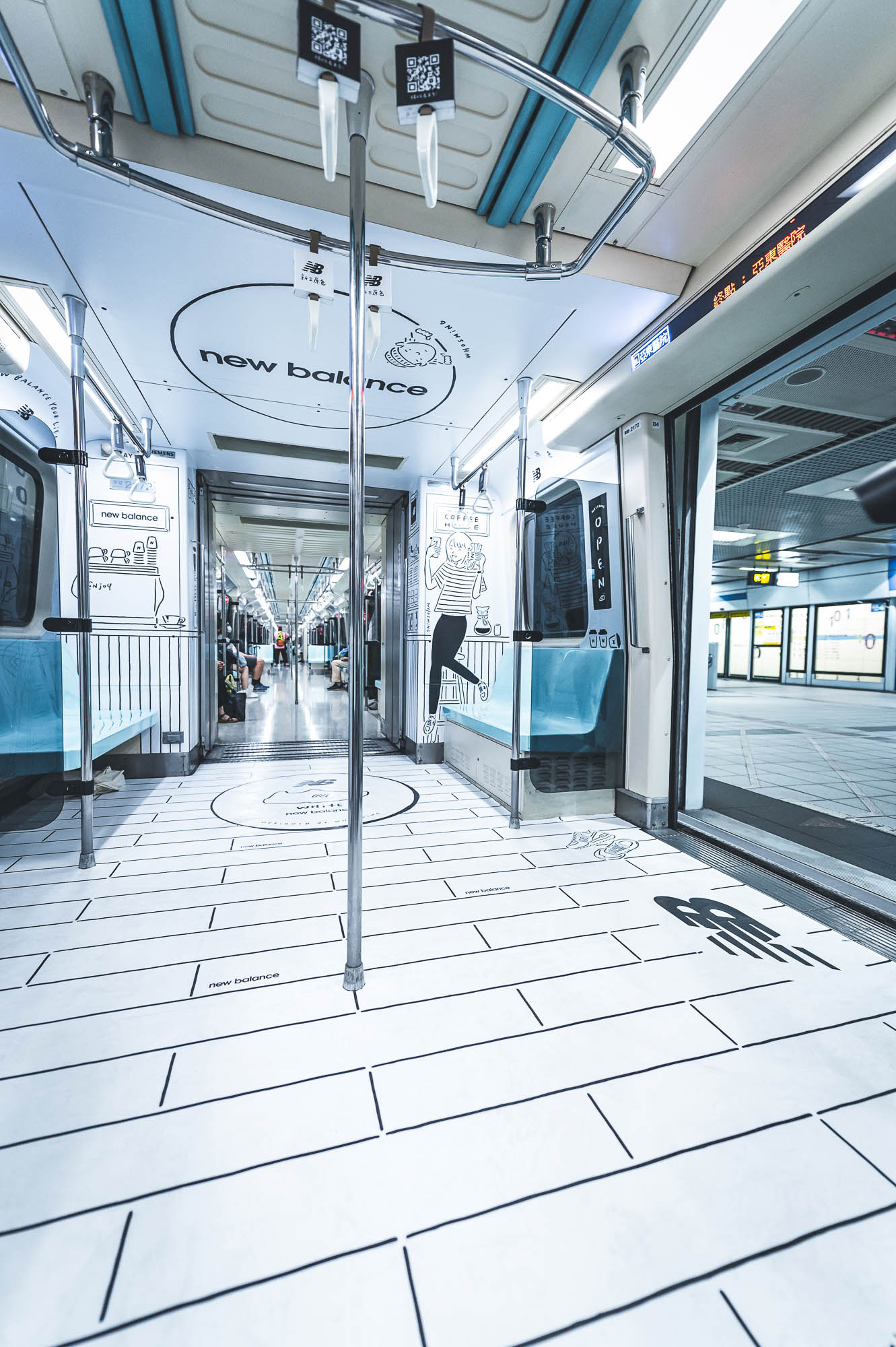 如果從黑色空間走過來,你能發現插畫家 WHOSMiNG 在短短一節車廂中藏了劇情變化,從家中出發、經過城市水泥叢林、最後到達咖啡廳與朋友會合。New Balance 白鞋一直深受女孩們歡迎,穿去咖啡廳再適合不過,設計簡約同時又有鞋側大 N 好識別,即便是女孩們多變的日常穿搭風格都能輕鬆上手,上下班(課)通勤時疲累的話,在捷運上跟 New Balance 還有插畫家 WHOSMiNG 喝一杯 2D 咖啡吧。