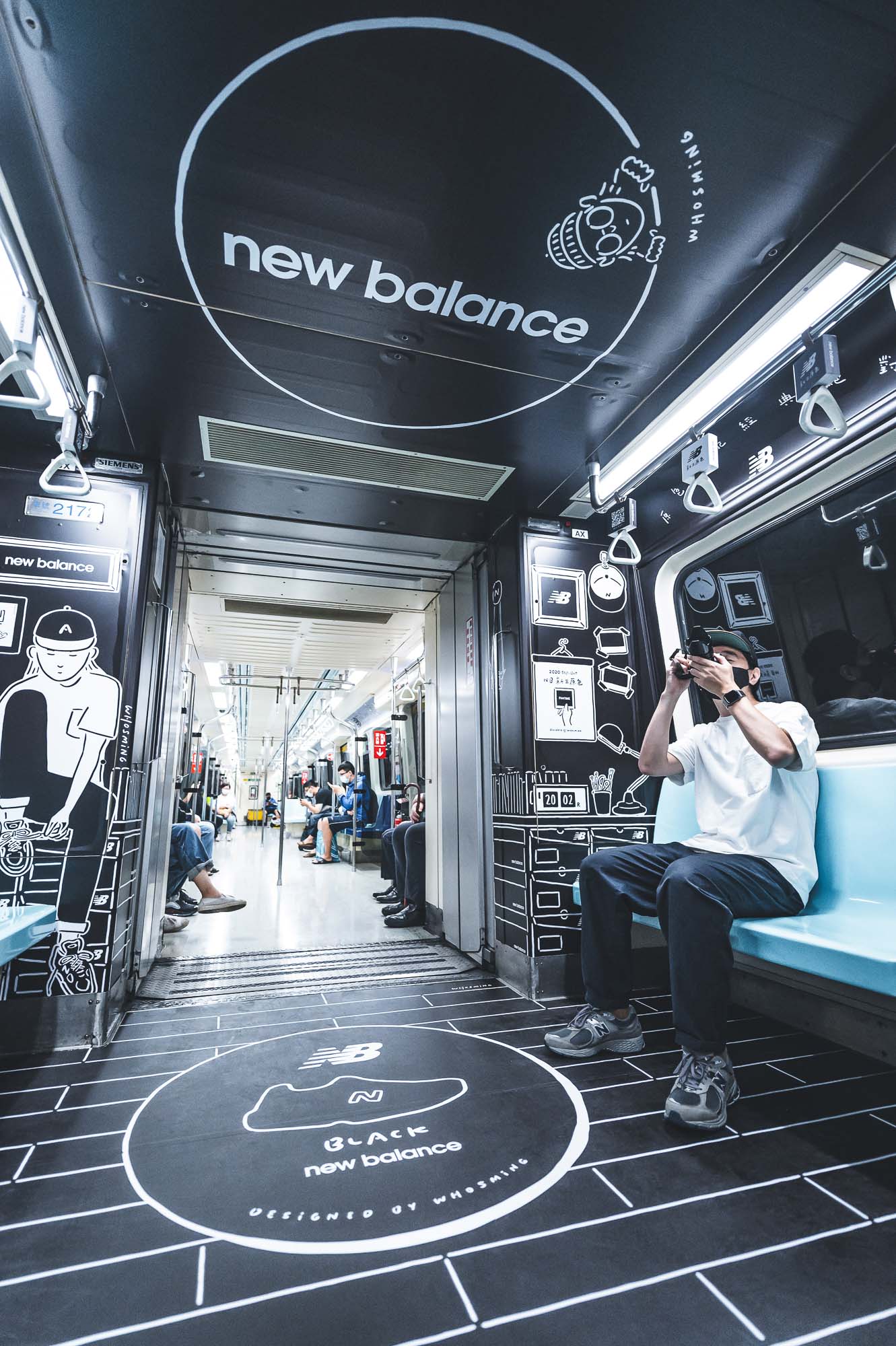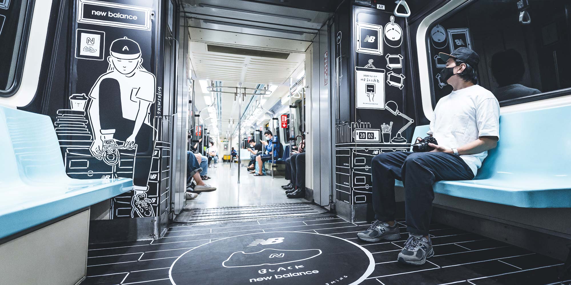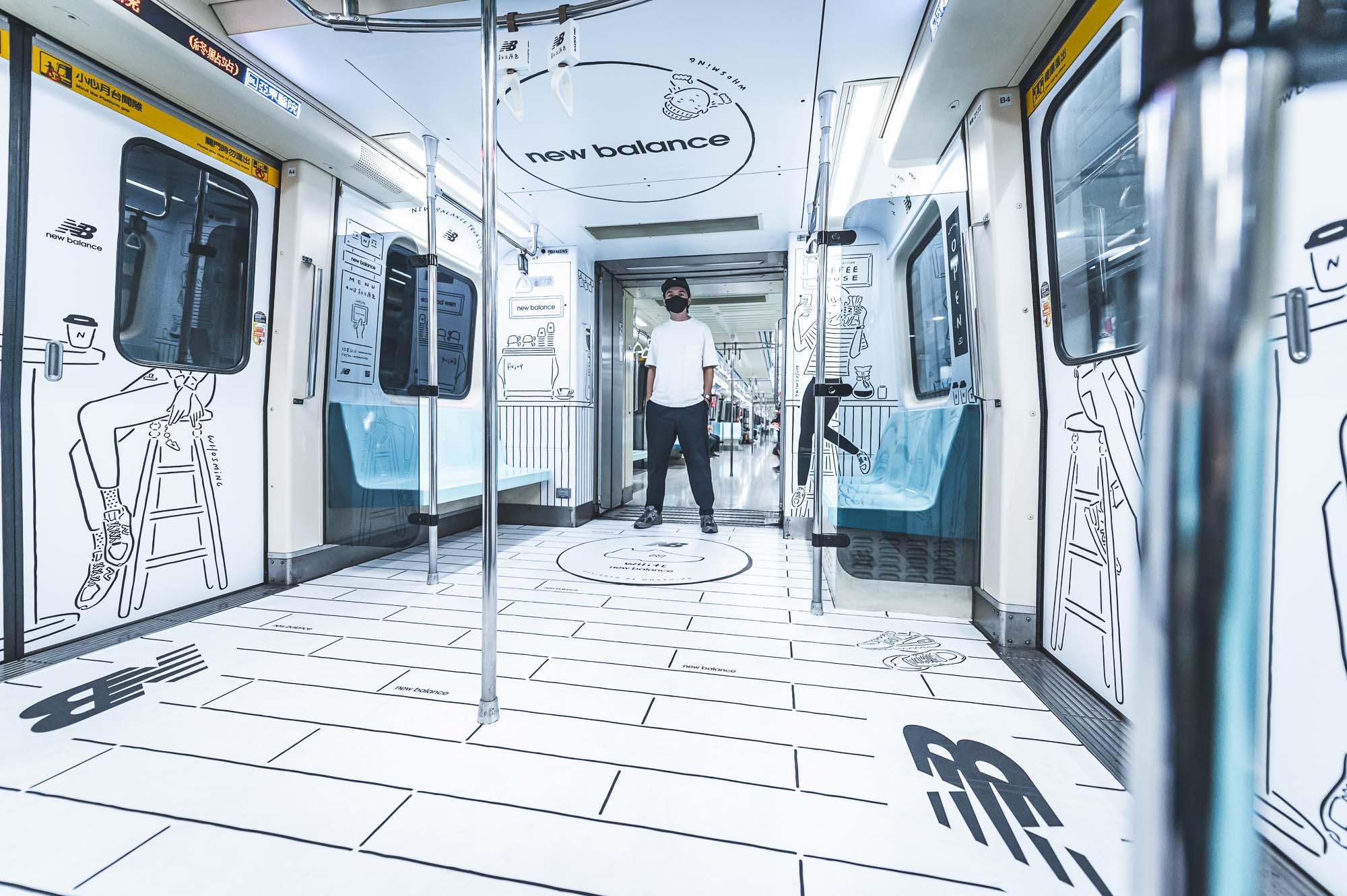 這次 NB 車廂是我們勘履與插畫家 WHOSMiNG 一起合作的作品,在不到兩週的時間內從零到有完成設計、繪圖,WHOSMiNG 跟我們分享這是他近期最具挑戰性的作品,尤其以往只在平面創作的他,這此跨足到捷運車廂內立體空間,繪畫之前的構想就來得更加重要。而就像許多設計師在打造鞋子時會放一些隱藏小彩蛋,新聞稿刻意不明說等著鞋迷自己去發現,那 WHOSMiNG 在 NB 新三原色捷運 2D 潮流車廂是否有什麼巧思?「因為我很喜歡喝咖啡,所以白色咖啡廳主題空間有很多咖啡杯,仔細看上面還有笑臉符號」WHOSMiNG 說道,另外還有一個勘履獨家的細節,就是黑色臥室的男生角色,WHOSMiNG 是擷取 2019 年 Grey Day 與我們合作的其中一個人物而來,前後串連呼應,且這位角色其實就是 WHOSMiNG 本人投射,他希望這次藉由這次車廂內的個性元素,反應出 New Balance 迷們的生活態度。