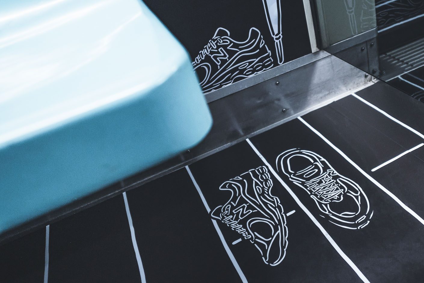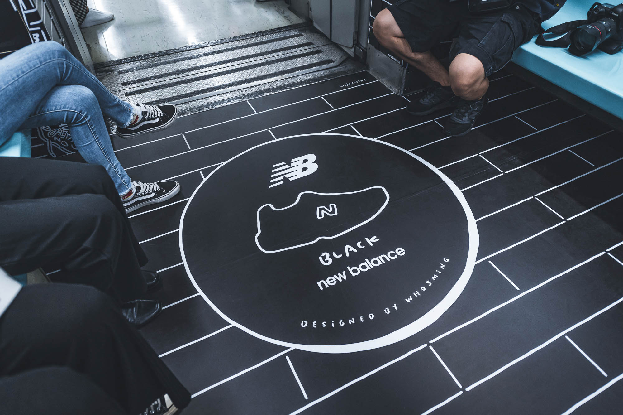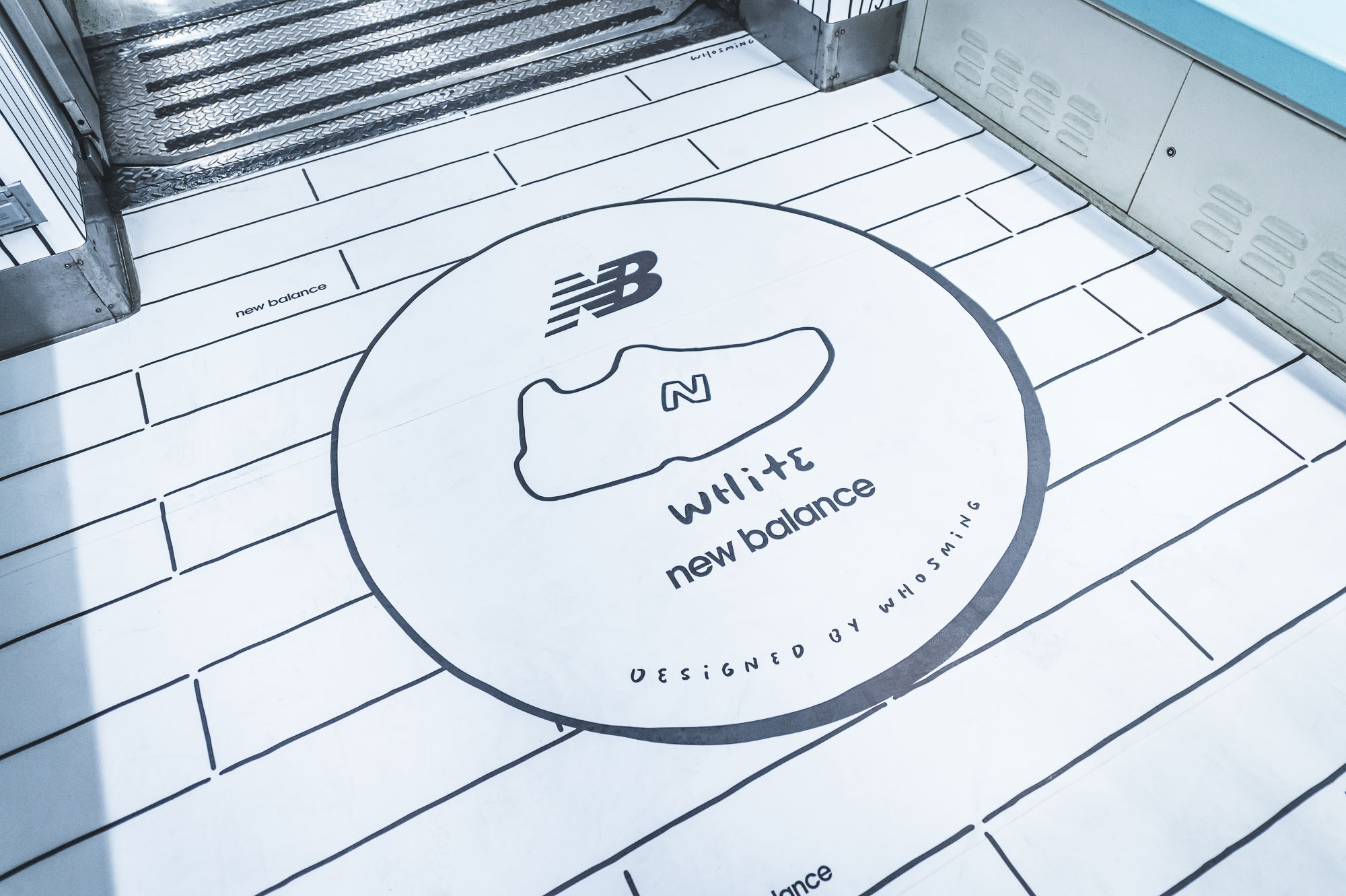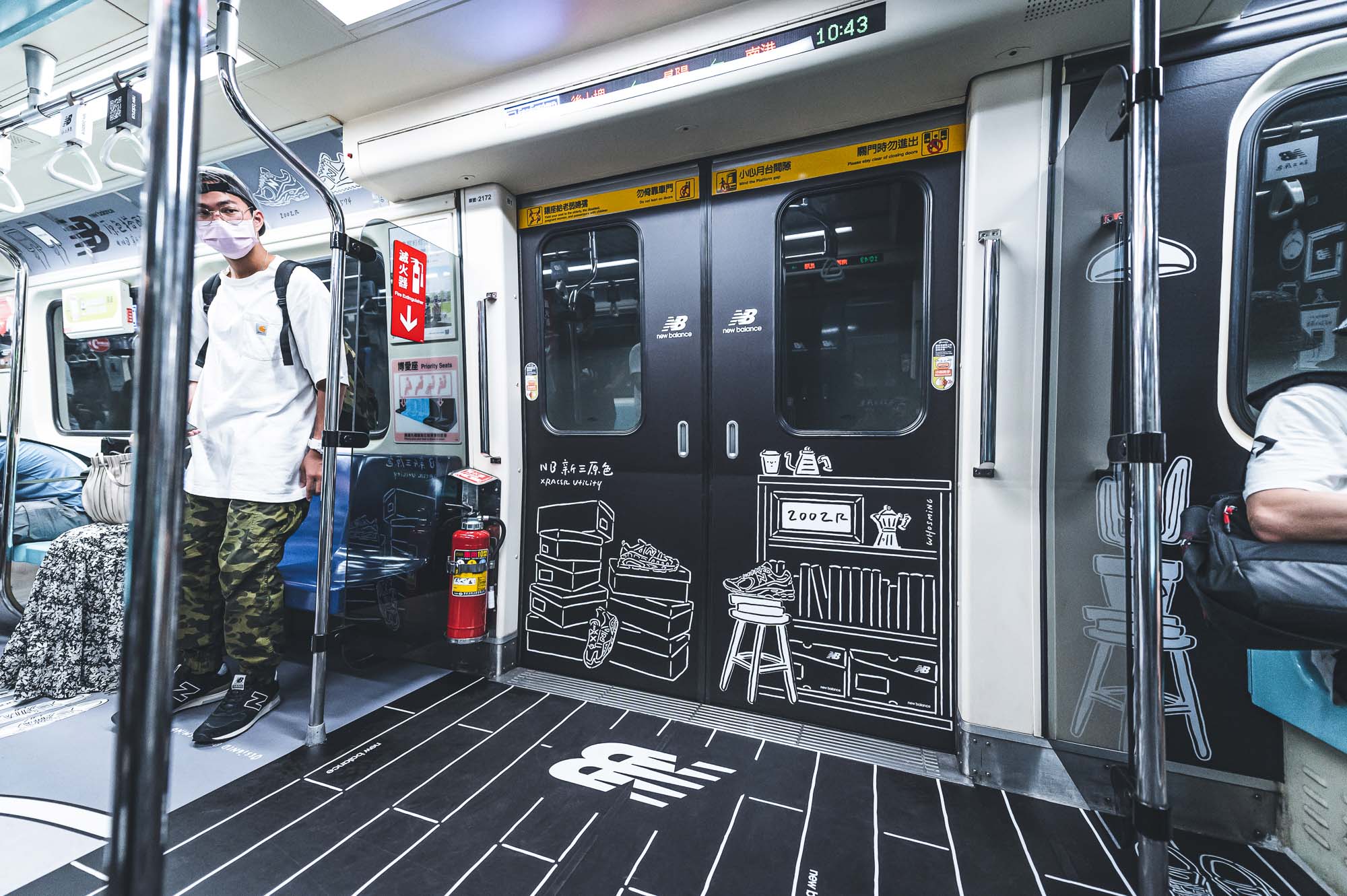 這次 NB 車廂是我們勘履與插畫家 WHOSMiNG 一起合作的作品,在不到兩週的時間內從零到有完成設計、繪圖,WHOSMiNG 跟我們分享這是他近期最具挑戰性的作品,尤其以往只在平面創作的他,這此跨足到捷運車廂內立體空間,繪畫之前的構想就來得更加重要。而就像許多設計師在打造鞋子時會放一些隱藏小彩蛋,新聞稿刻意不明說等著鞋迷自己去發現,那 WHOSMiNG 在 NB 新三原色捷運 2D 潮流車廂是否有什麼巧思?「因為我很喜歡喝咖啡,所以白色咖啡廳主題空間有很多咖啡杯,仔細看上面還有笑臉符號」WHOSMiNG 說道,另外還有一個勘履獨家的細節,就是黑色臥室的男生角色,WHOSMiNG 是擷取 2019 年 Grey Day 與我們合作的其中一個人物而來,前後串連呼應,且這位角色其實就是 WHOSMiNG 本人投射,他希望這次藉由這次車廂內的個性元素,反應出 New Balance 迷們的生活態度。