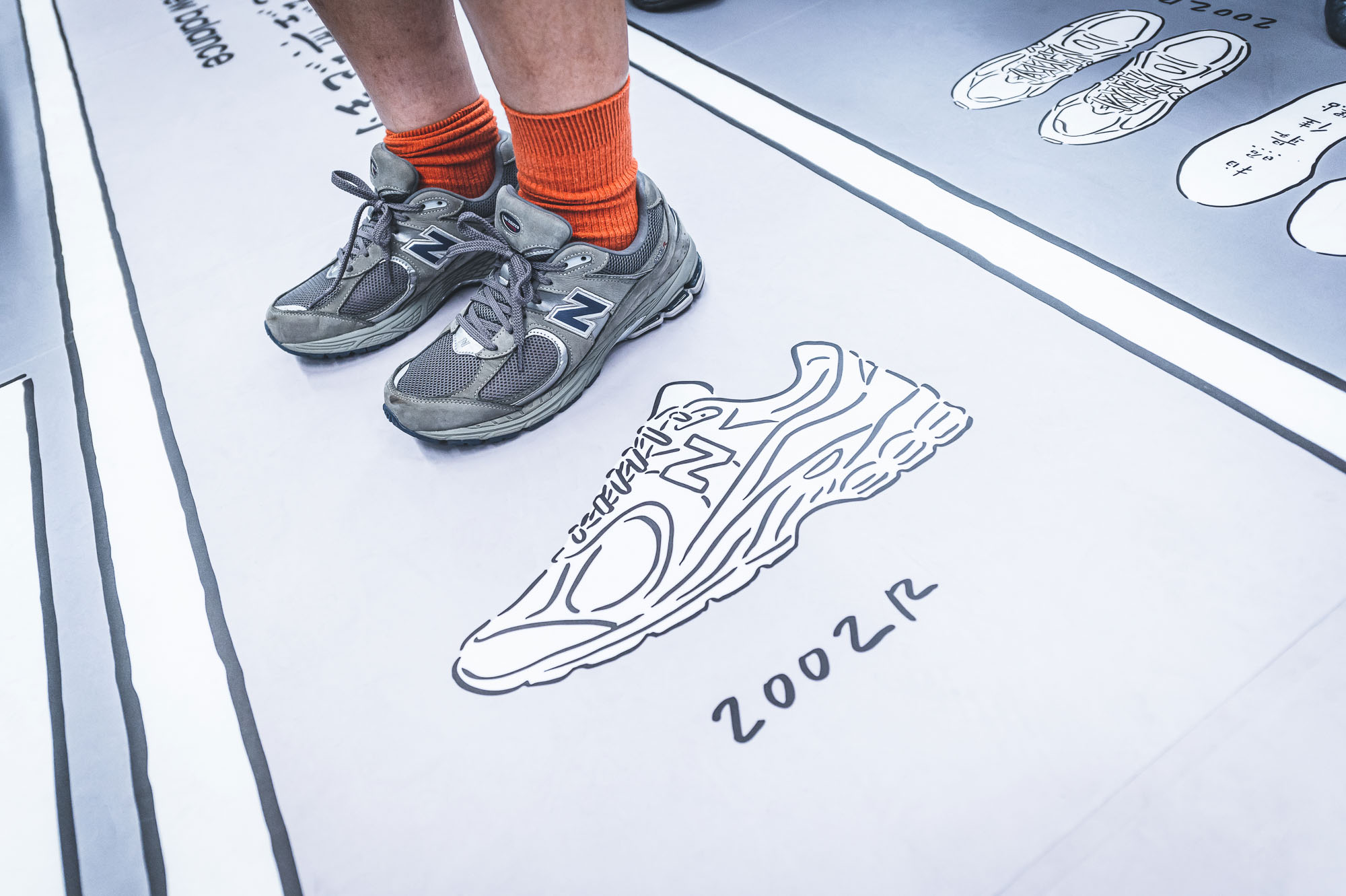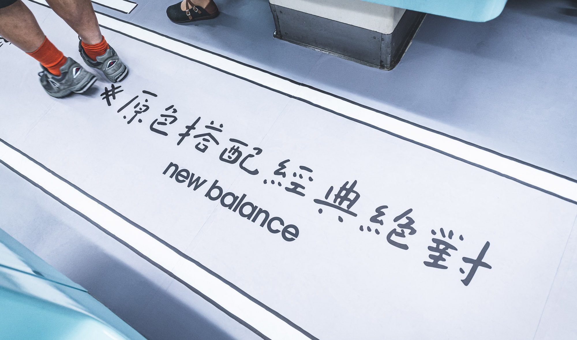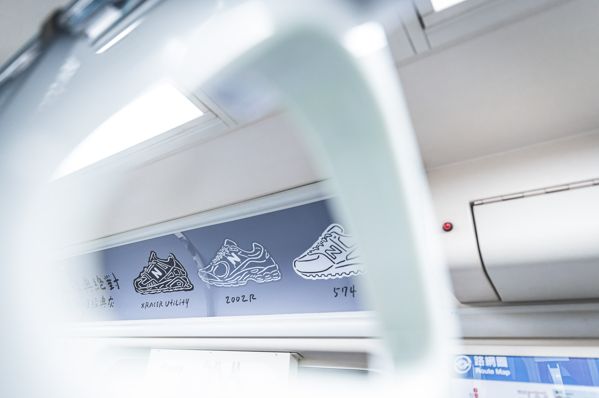 在車廂各區塊你發現不同型號鞋款,黑色部份包含 X-Racer Utility、2002R;白色則為 247v3 和 574,至於 New Balance 最具代表性的灰則是重頭戲,兩排面對坐位前方放上 247v3、574、990v5、2002R 四雙鞋款,從一般休閒到專業機能、還有最近復刻的話題鞋款,如果今天有幸搭上 NB 車廂,而且還穿著對應 New Balance 鞋款,這麼巧合的緣分不拍個限時動態打卡說不過去。
