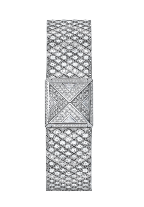 愛馬仕Medor腕錶的超華麗鑽石版本,大家熟悉的立體金字塔造型,珠寶工匠運用了三種不同的鑽石與兩種鑲嵌工藝,逐顆鑲嵌共835顆鑽石,歷經3個月才完成這只千萬鑽錶。