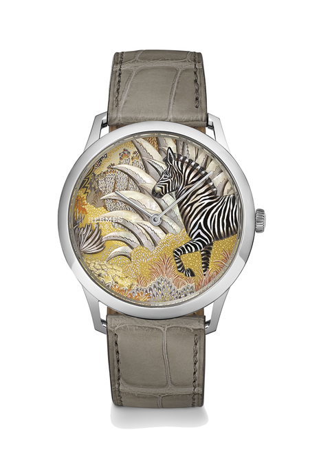 Mountain Zebra林中斑馬腕錶,珍珠母貝精雕與微繪工藝錶盤,限量24只,參考價格NT2,340,400,Hermès。