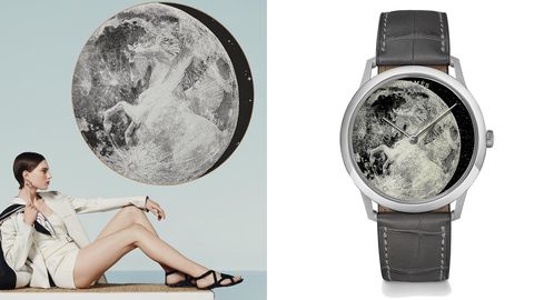 這只腕錶圖案出自古希臘神話中的飛馬,來自一條2020年的愛馬仕圓形絲巾,由Dimitri Rybaltchenko創作。Hermès為了雕刻出在月球上飛揚的飛馬圖騰,錶盤請GB Microfab工坊打造,工匠使用到4種工藝,特殊的金屬化藍寶石水晶作為底盤、科技雷射雕刻,白漆塗層,再鑲嵌深藍色月牙型砂金石,才重現出神話中神秘的夢幻感。