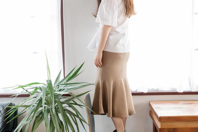 偏好韓系風格的女生一定都曾想嘗試魚尾裙的穿搭,但臀部包覆的設計往往又是令人卻步的原因。選擇版型較挺的面料可以讓身形隱藏於裙裝的輪廓當中,而選擇卡其色調還能稍微減低魚尾裙的存在感,同時滿足特色裙裝穿搭也不會高調地太讓人注意身材狀況。而部分合身卻又拼接了漂亮弧度的裙襬,一穿上就能表現優雅的淑女印象。