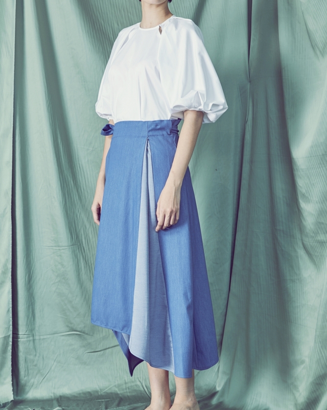 柔軟且垂墜度極高的面料賦予這件長裙優雅洗鍊的氛圍,裙襬不規則的設計讓裙裝在動態時能更具仙氣感受。建議將上衣紮進內裡,側邊的綁帶細節可以提升整體造型的可看性,深淺的藍色調拼接則是能輕鬆讓一件單品營造出層次效果,對於喜愛簡約俐落風格的都會女性而言尤其適合。