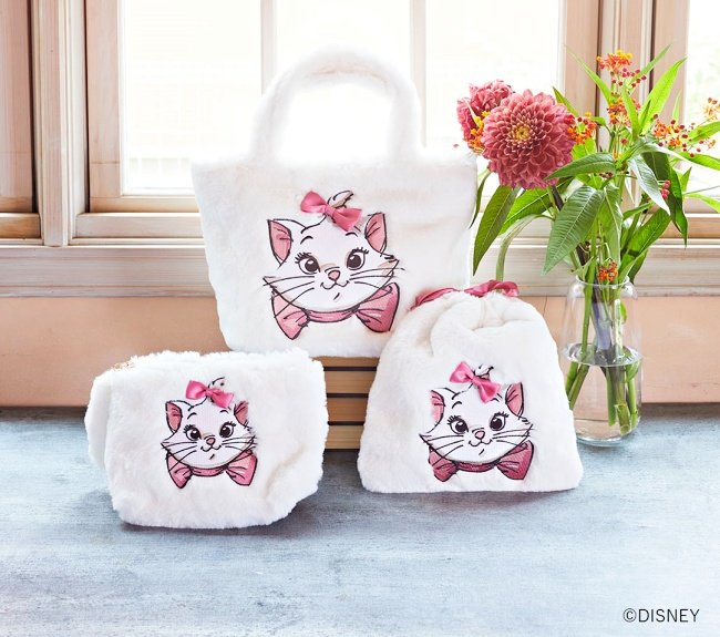 雪一般純白的毛色、頭上以及頸部綁著浪漫粉色蝴蝶結緞帶…《貓兒歷險記》中,紅遍全球的瑪麗貓化身成手提袋,束口袋和錢包啦!柔軟的毛茸茸觸感、加上立體蝴蝶結裝飾,櫻花妹正暴動ing!