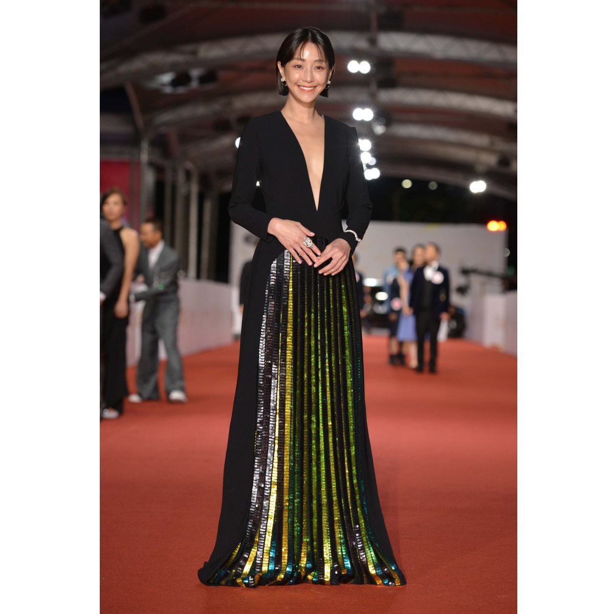 謝欣穎雖然穿上優雅的長袖禮服,但逼近肚臍的深V設計,讓這套深色系的禮服看來多了性感的女人味,裙襬上閃耀的彩色亮片拼接也讓整套禮服多了層次感!