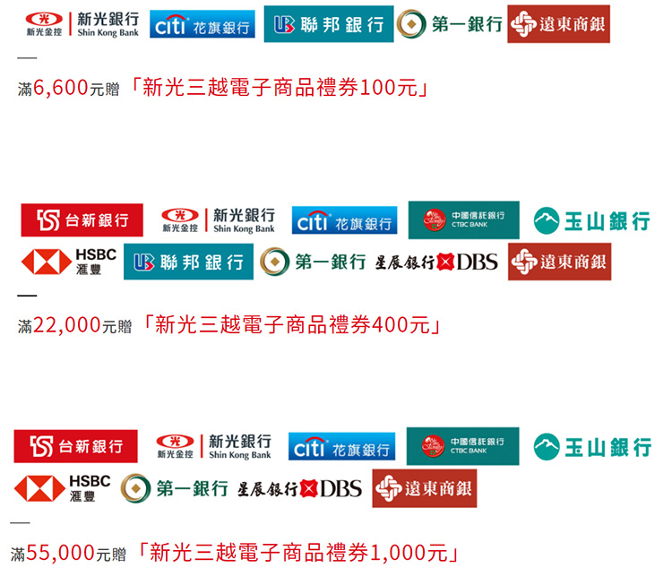 活動期間內,持指定銀行信用卡至新光三越指定店別,當日當店單卡累計達指定門檻,即可憑信用卡、同卡號簽單及銷貨明細表,至贈品處兌換「指定金額電子商品禮券」一份。