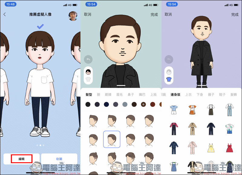 在編輯頁面,包括虛擬人像的髮型、臉、眼睛、眉毛、鼻子、嘴巴甚至妝容等外表都有多種樣式和顏色可選擇。服飾方面,也能挑選各式各樣的服飾進行搭配,設定一切就緒後就能按下畫面右上角的「完成」: