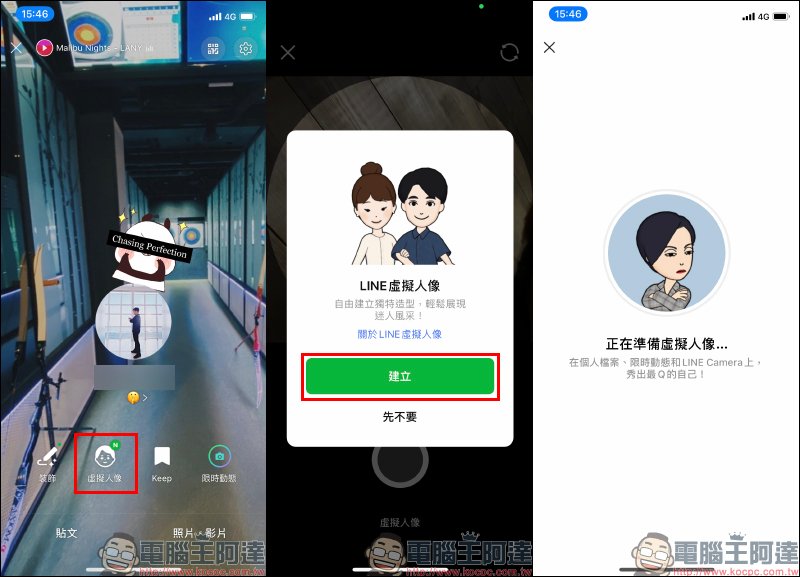 只要符合上述的系統與 LINE App 版本條件,現在起都能在 LINE App 使用 LINE 虛擬人像功能。用戶只要在個人檔案頁面點選「虛擬人像」按鈕,接著選擇「建立」就能開始建立虛擬人像: