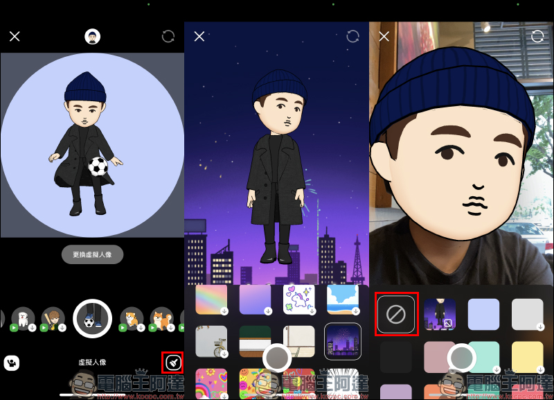 用戶也能設定虛擬人像自拍的背景,除了各種主題背景可選擇,也能關閉背景進行虛擬人像自拍,這時會開啟前相機自拍,不過臉部的部分則替換成虛擬人像: