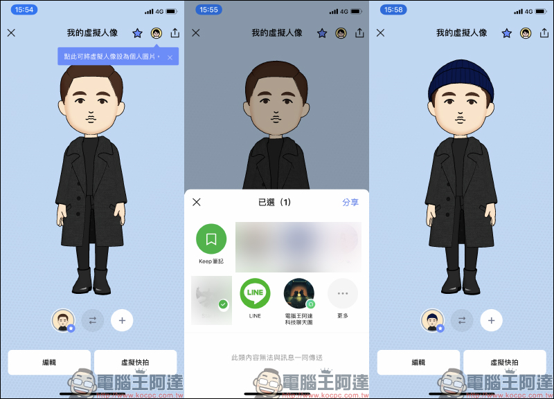 這時就建立了第一個專屬自己的 LINE 虛擬人像,用戶也能在「我的虛擬人像」頁面新增其他虛擬人像。另外,我的虛擬人像頁面也能點選「分享」將這組靴你人像分享給 LINE 好友。倘若想變更外表、服裝,也都能點選「編輯」隨時修改:
