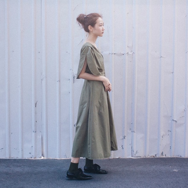 收腰的洋裝版型應該是相當秀氣的樣式,但利用了較為硬挺的面料讓整體多了一份中性味道。大 V 領的剪裁與開襟的設計讓這件洋裝不管是正式還是休閒場合都適合穿搭。值得注意的是側邊的袖子連結腰身的設計可以有效修飾手臂線條,搭配上V 領就讓顯瘦度再加乘。