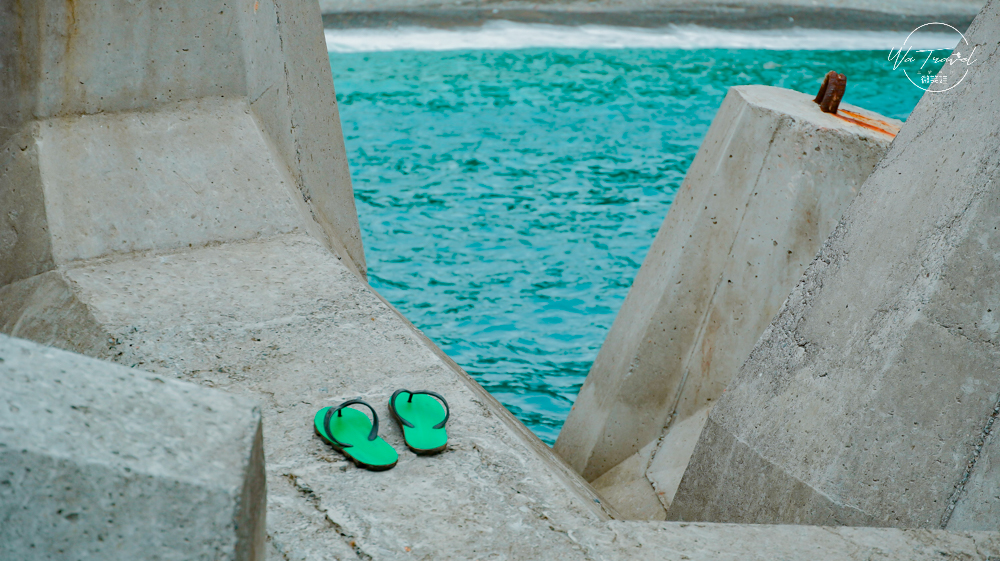 前往漁港一進去後,右手邊就有一個水泥牆架上鐵架的樓梯,讓人好奇往上爬,沒想到看到意外的美景!一片瞭望的無人沙灘,沙灘上還有著「許願石」特意還選擇了沙灘上「綠色的石頭」做堆疊。