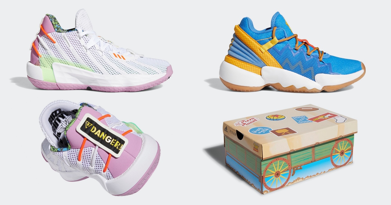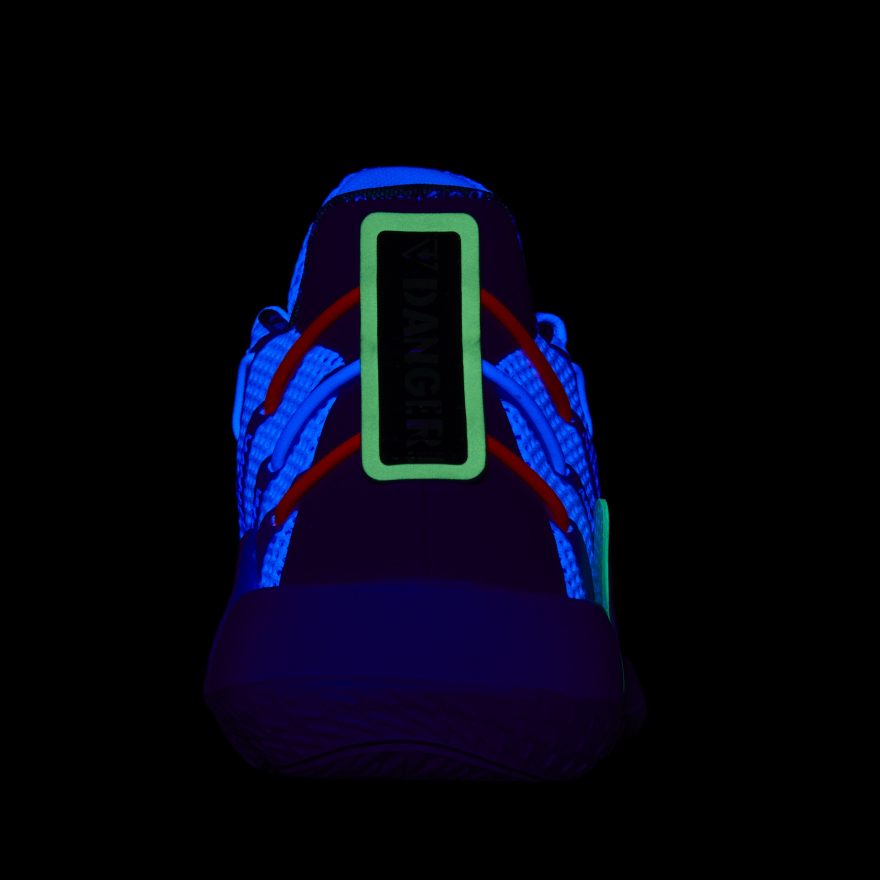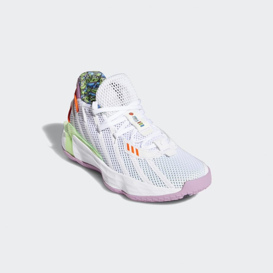 adidas Dame 7 ‘Buzz Lightyear’ 則以胡迪的摯友「巴斯光年」為設計概念,鞋身以白色為主色調,輔以粉紫色及螢光綠充分展現巴斯光年的太空裝配色,鞋側 TPU 保護片同樣以螢光綠呈現,猶如巴斯光年招牌盔甲;鞋後跟則繡上 DANGER 字樣還原巴斯光年背後的太空噴射器,鞋身多處皆採用夜光設計,完美詮釋巴斯光年作為太空騎警的身分!鞋身內層則注入滿版的三眼怪花紋,細節處處充滿彩蛋,正如同《玩具總動員》眾角色們總是帶給影迷滿滿的驚喜,也鼓勵小朋友穿上 adidas x Toy Story 聯名鞋款都能像胡迪、巴斯光年一樣,在球場上與同伴們為了目標一起勇敢奮戰!此款臺灣發售大童、中童鞋,定價分別為 3,090 元、2,690 元。