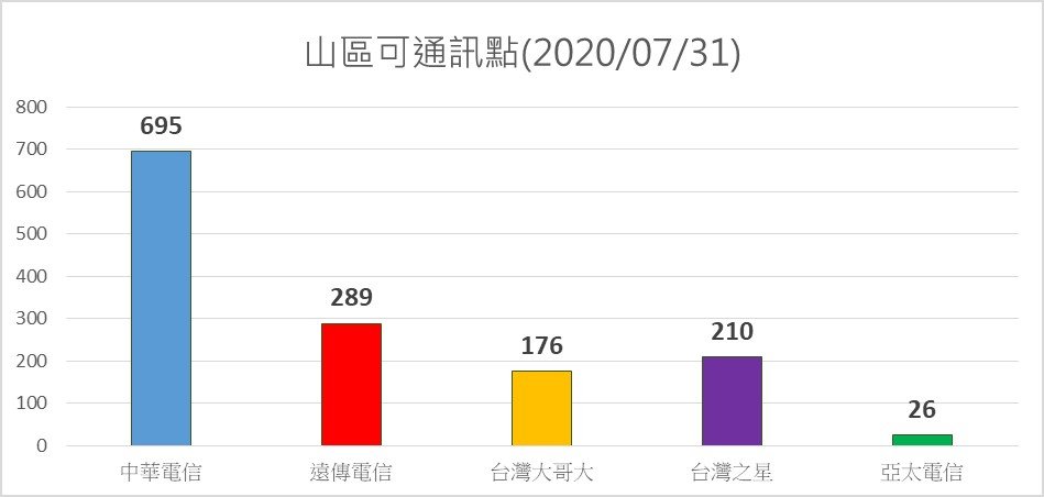 根據林務局所提供的資料來看,中華電信以695個可通訊點在山區是收訊最佳的電信業者,其次是遠傳電信的 289 個通訊點 ,第三名則是台灣之星的 210 個通訊點,電信獲利王~台灣大哥大則以176 個通訊點落居第四,最晚與林務局合作的亞太電信則以 26 個通訊點居第五。
