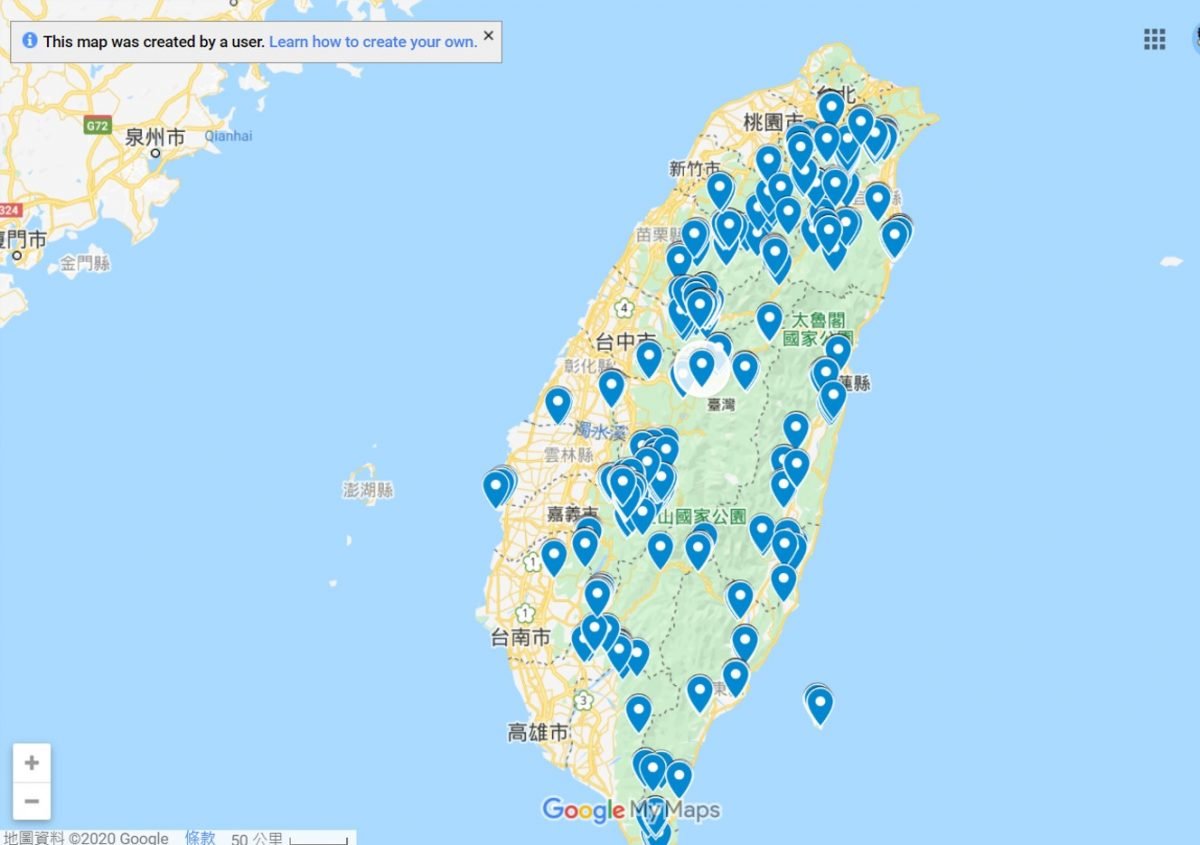 只要點選【 山區手機訊號地圖 Google 版】,就會出現標示有706個手機可通訊點的Google地圖。