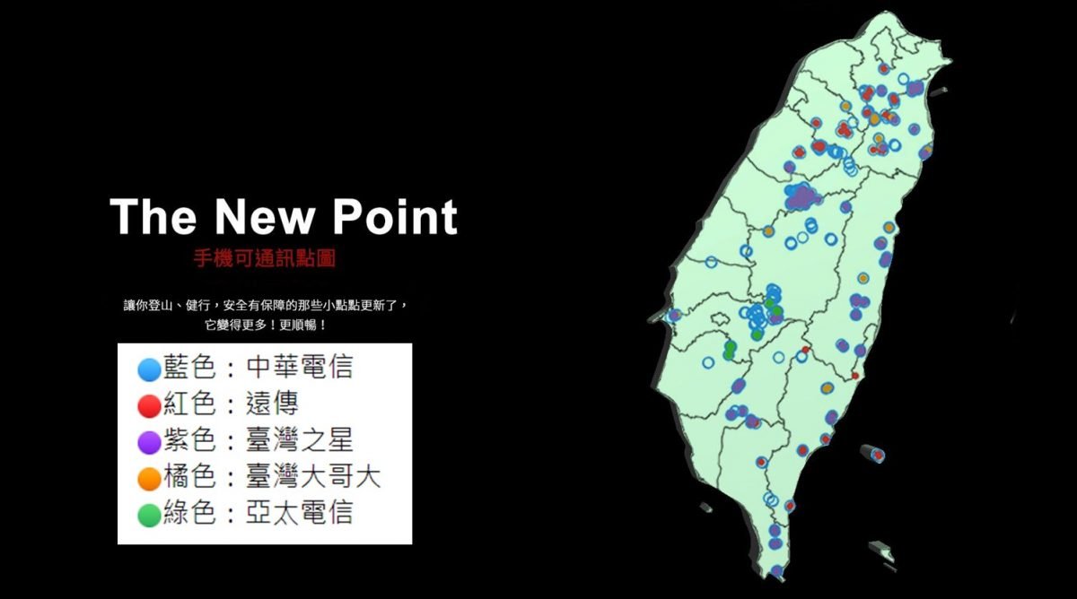 1.林務局「山區手機訊號地圖」與各大電信業者手機可通訊點分布: